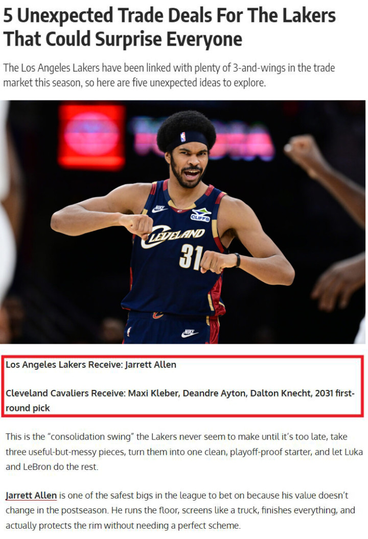 说到这,据美媒《FW》透露湖人正在和骑士商讨一笔用艾顿、克内克特、克勒贝尔、31年首轮换贾阿特·阿伦的4换1交易。