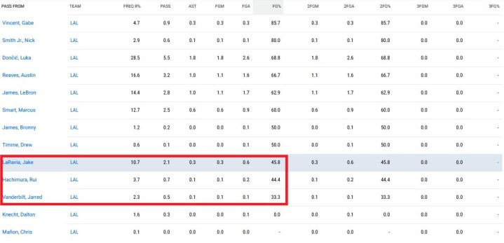 此外,如下图所示艾顿的进攻还展现出良好的兼容性——只有接到拉拉维亚、范德比尔特、八村塁的传球形成投篮后投篮率不足50%。